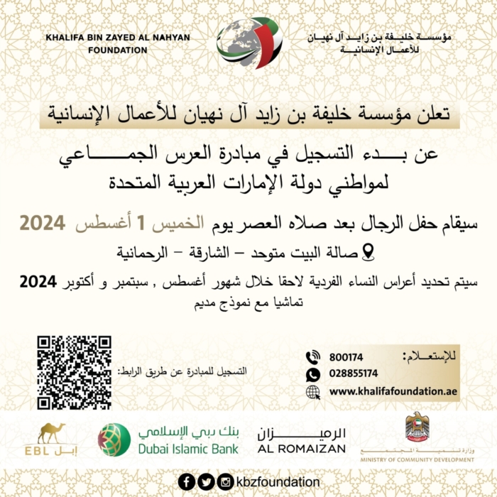 تعلن مؤسسة خليقة بن زايد آل نهيان عن بدء التسجيل في مبادرة العرس الجماعي لمواطني دولة الإمارات العربية المتحدة بتاريخ 1 أغسطس 2024 يوم الخميس، حفل الرجال بعد صلاه العصر في صالة البيت متوحد - الشارقة - الرحمانية.